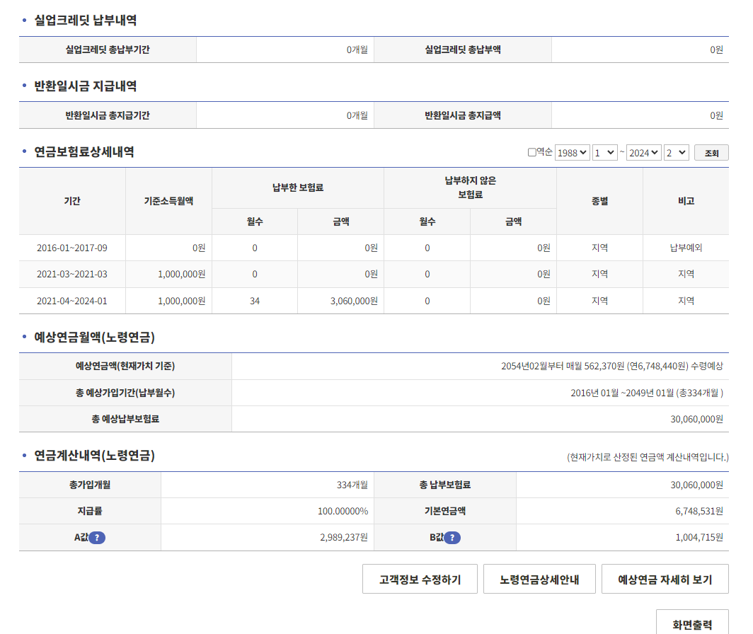 4️⃣ 가입내역 조회 서비스를 보면 국민연금 가입자의 이름과 총 가입 기간, 총 납부 내역 그리고 실업 크레딧 납부 내역과 여금 보험료 상세 내역 그리고 예상연금월액을 계산한 계산액까지 모두 한 눈에 볼 수 있고 이 자료를 출력하고자 하시는 분들은 화면 출력으로 프린트 인쇄 서비스를 이용 할 수 있습니다.