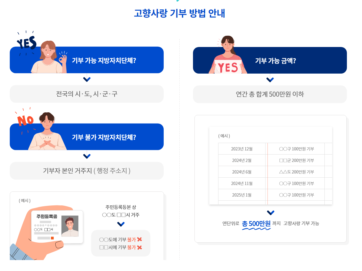 고향사랑 기부제는 기부자의 주민등록 상 거주지를 제외한 지역 자지 단체에 기부를 할 수 있습니다. 예를 들어 경기도 남양주시에 거주하는 사람은 <경기도, 남양주시>에 기부가 불가하며 <서울,인천,전북,전남 등> 타 지역에 연간 총 500만원의고향 사랑 기부를 할 수 있으니 참고하시기 바랍니다.