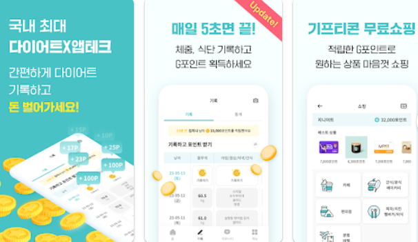 4️⃣네 번째 추천 드리는 어플은 매일 체중 기록 식단 일지를 작성하면서 G 포인트 즉 캐시를 지급 받는 형식의 어플입니다. 내 몸의 변화 그래프를 확인하면서 국내 최초 다이어트 커뮤니티 활성화를 위해서 개설이 되어진 서비스입니다.