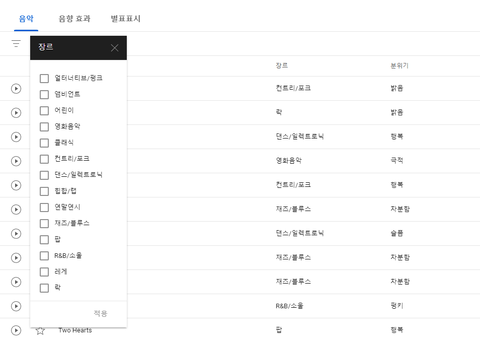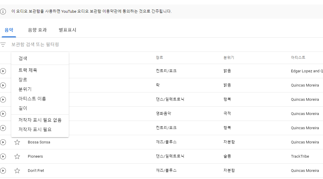 ✅ 유투브 스튜디오에서 제공하는 음악에는 여러가지 종류로 구분이 되어집니다. <트랙제목, 장르, 분위기, 아티스트 이름, 길이>로 음악을 구분하여 검색 할 수 있으며 가장 많인 선호하는 검색 부분은 바로 "장르, 분위기"입니다.
