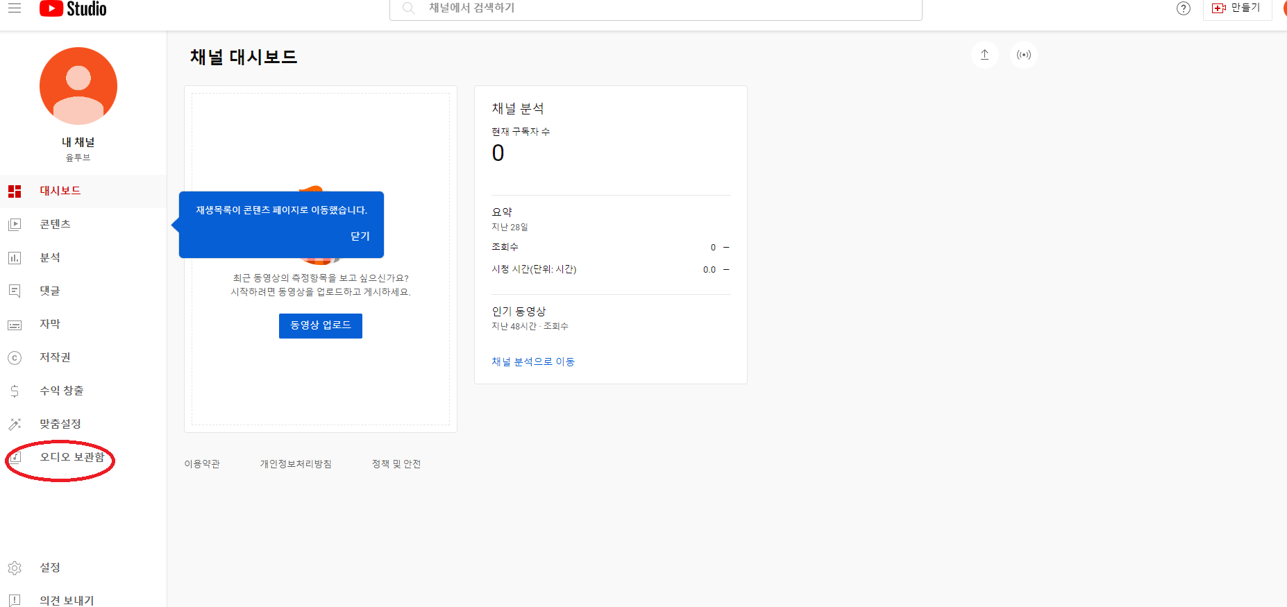 먼저 영상에 사용될 음악과 효과음을 다운 받기 위해서는 채널 메인 화면에 있는 오디오 보관함을 클릭하셔야 합니다. 메인 화면 왼편 가장 아래에 있는 오디오 보관함을 클릭하시면 여러가지 음악을 다운 받을 수 있는 화면으로 넘어가게 됩니다.