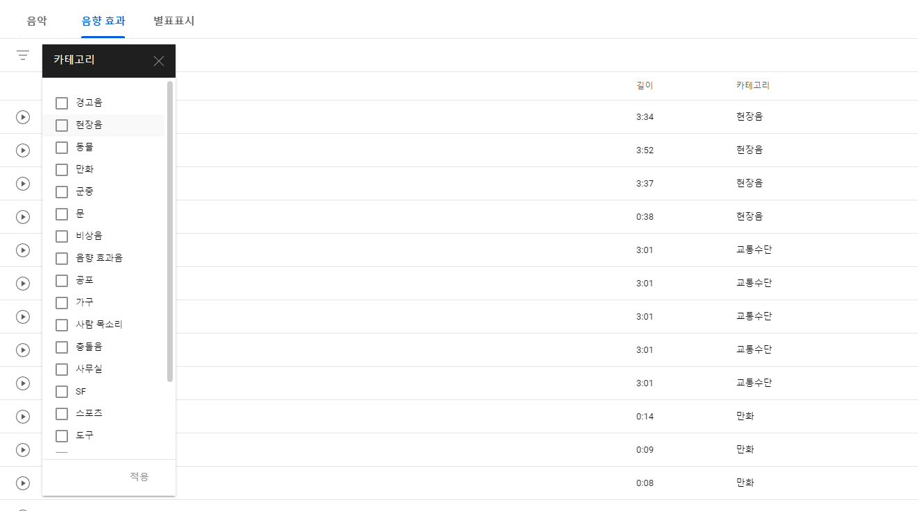 ✅ 마지막으로 살펴볼 유투브 효과음 무료 다운로드입니다. 음악 옆에 음향효과를 클릭하시고 <카테고리, 길이>중 하나를 선택하시면 됩니다. 카테고리를 선택하시면 여러가지 효과음으로 사용되어질 카테고리가 나옵니다. <경고음, 현장음, 동물, 만화, 군중, 문, 비상음, 음향효과음> 등 다양한 효과음들을 이용 할 수 있습니다.