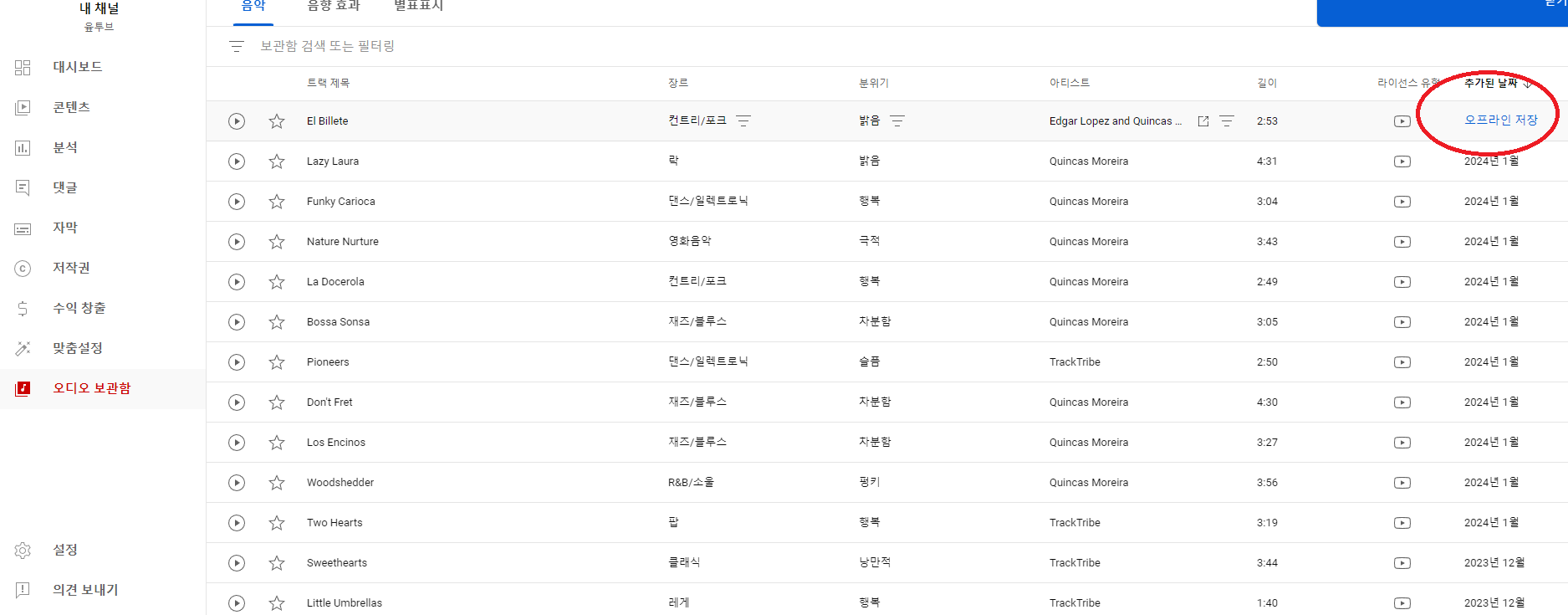 오디오 보관함에서 여러가지 음악 차트가 나오게 됩니다. 그 때 내가 원하는 오디오의 제목이나 분위기 또는 그 음악의 재생 시간을 보시고 내가 원하는 스타일의 노래를 확인 후 추가된 날짜 부분에 마우스 커서를 가져다 되시면 오프라인 저장으로 mp3 파일을 다운 받을 수 있도록 서비스를 무료로 제공하고 있습니다.