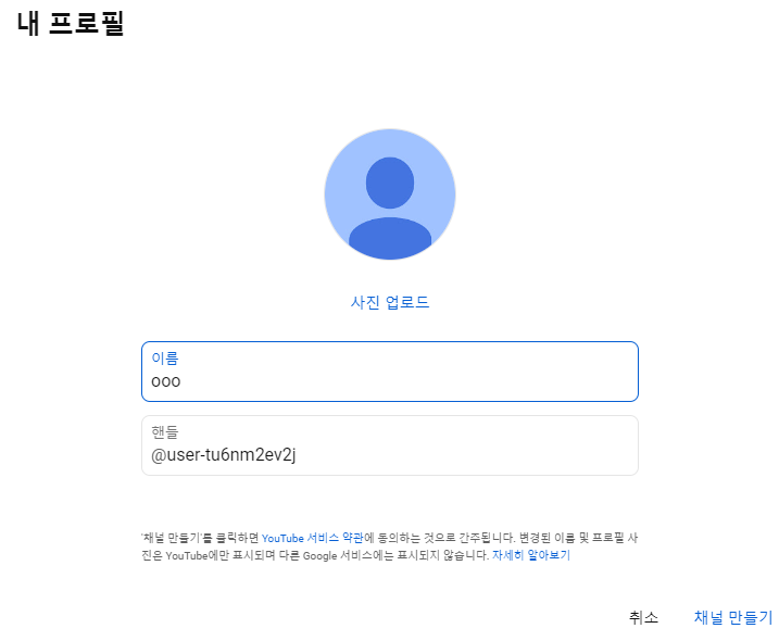 로그인은 구글에 가입되어 있는 아이디로 접속하시면 되고, 프로필은 처음 사용하시는 분들이 하셔야 하는 부분이네 사진과 채널 이름을 넣으면 핸들이라는 부분에 내 채널 코드가 자동적으로 생성이 되어지고 채널을 만들면 첫 번째 작업이 모두 마쳐지게 됩니다.