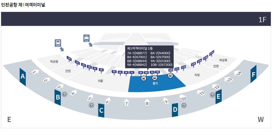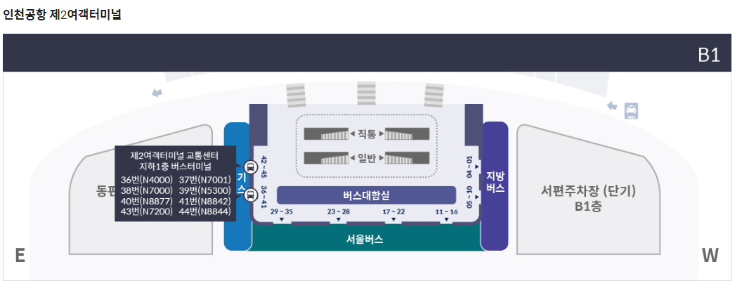 버스 탑승 정류장은 1여객 터미널, 2여객 터미널 위치가 각기 다릅니다. 1여객 터미널은 [1층 7-10번]터미널에서 버스 탑승이 가능하고, 2여객 터미널은 여긱 터미널 동편 주차장 쪽 42-45, 36~41번에서 탑승이 가능하다고 합니다.
