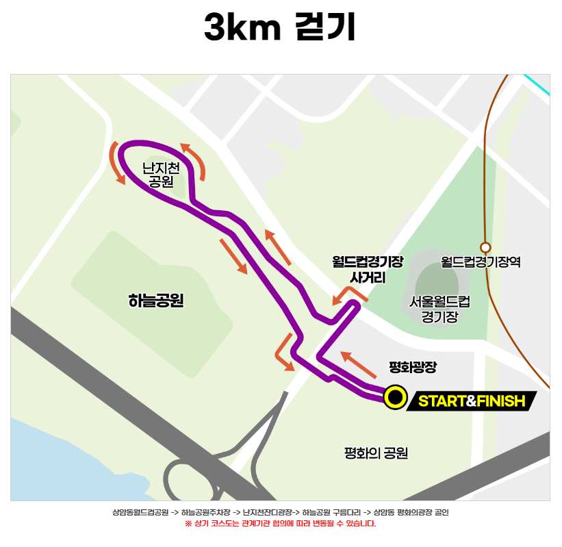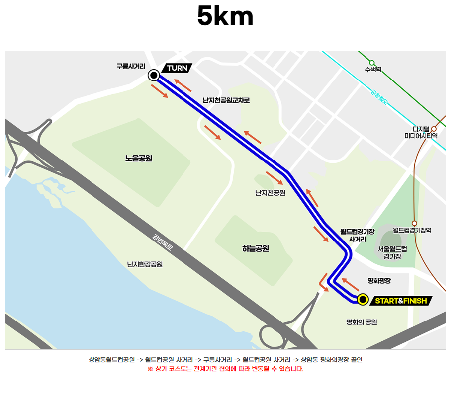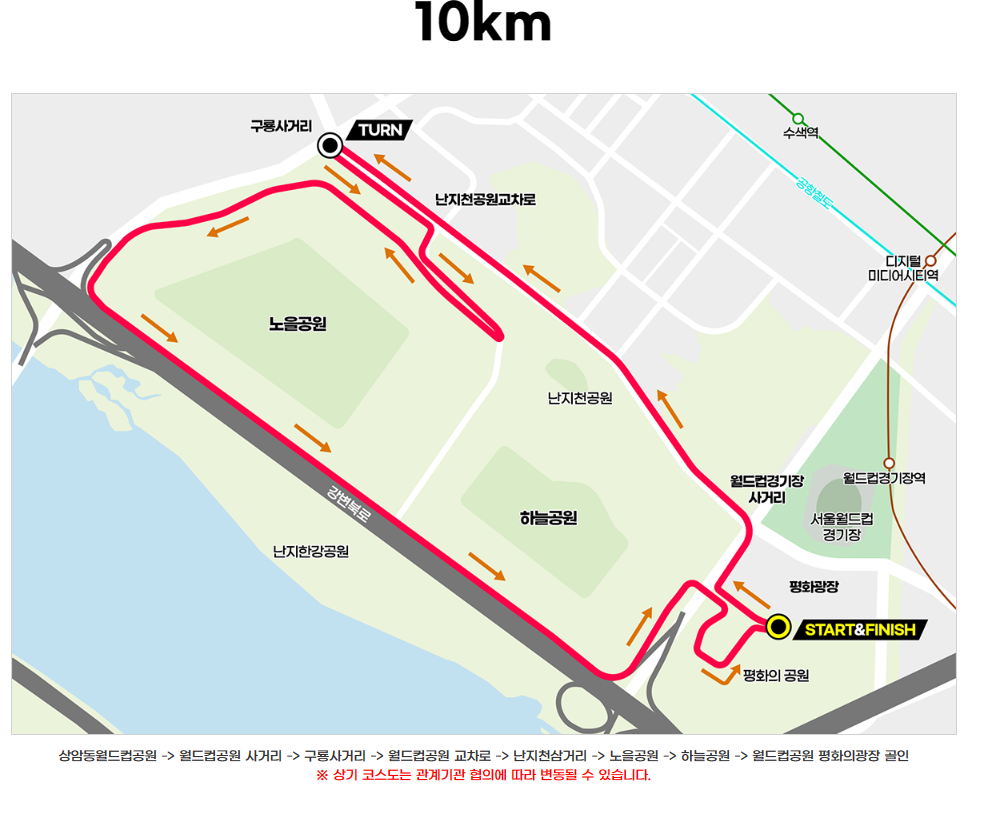 | 대회장수 | 개/폐회식 및 행사장은 상암 월드컵공원 평화의 광장에서 진행이 됩니다. 마라톤 구간은 [마포구 월드컵경기장 사거리~구룡사거리] 하늘공원 노을공원 일대입니다. |