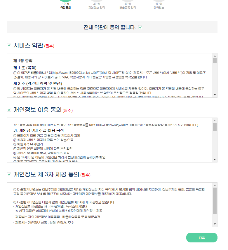 서비스 약관 동의를 진행하셔야 그 다음 서비스를 이용 하실 수 있습니다. 서비스약관, 개인정보 이용 동의, 개인정보 제 3자 제공 동의를 클릭하신 후 다음 2단계 기본정보 입력으로 넘어 갈 수 있습니다.