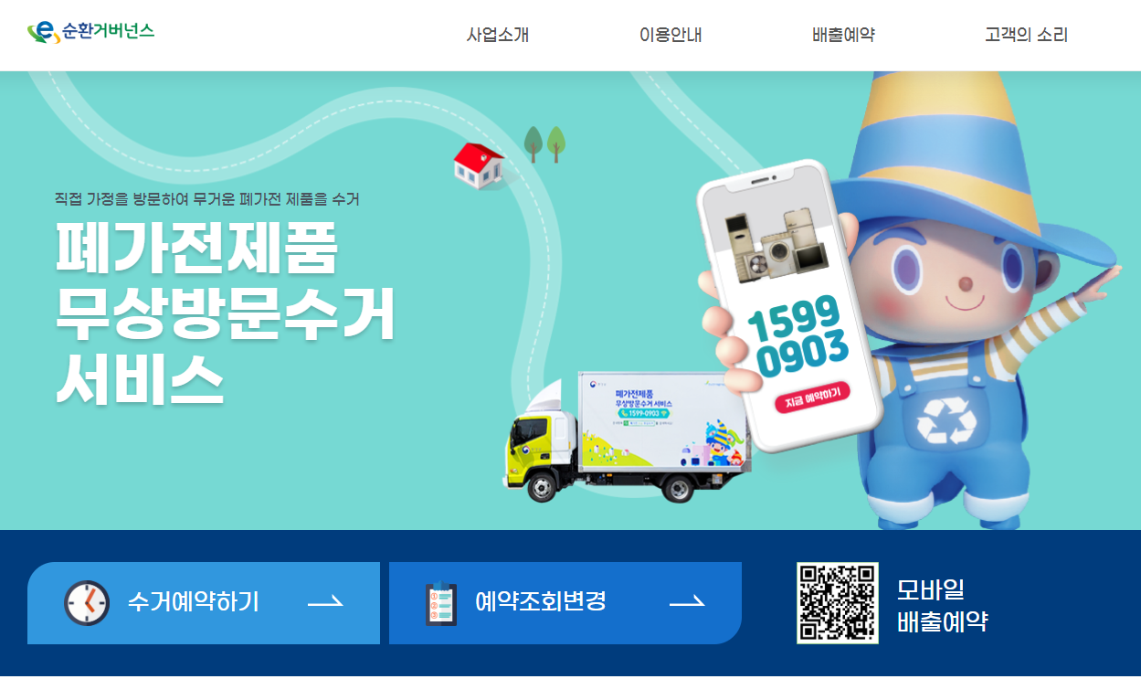 폐가전제품 무상 방문 수거 공식 홈페이지인 순환거버넌스 홈페이지를 통해서 수거를 진행 하실 수 있습니다. 모바일 보다는 PC로 신청하시는게 훨씬 간편하니 참고하시기 바랍니다.