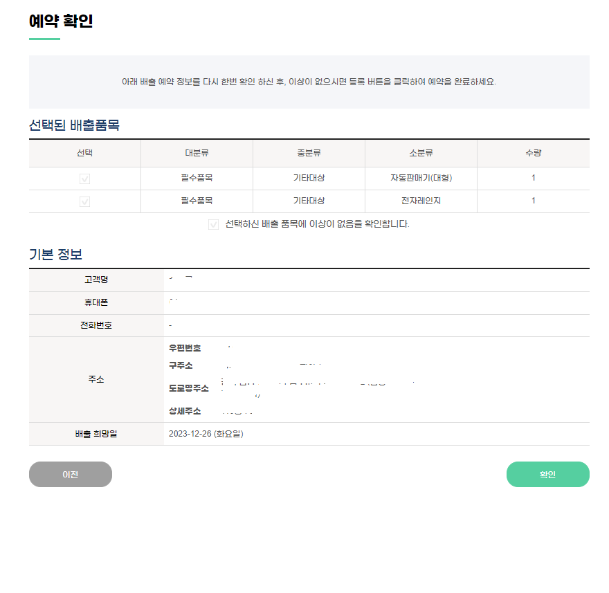 무상서비스 이용하고자 하는 품목이 모두 선택이 되었다면 마지막 예약 확인을 통해서 내가 입력한 수거 품목 그리고 수거 장소 기본정보등이 올바르게 기재 되었는지 체크하시면 모든 서비스 신청이 완료됩니다.