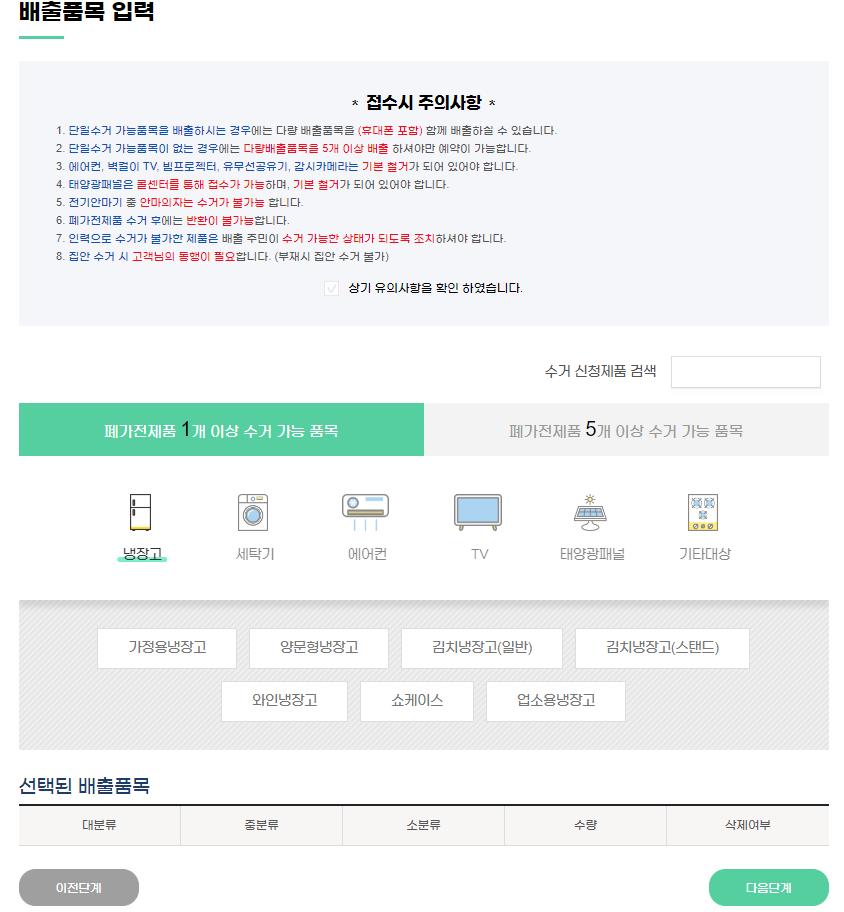 내가 배출하고자 하는 품목을 입력하셔야 합니다. 폐가전제품 1개 이상 수거 가능 품목과, 5개 이상 수거 가능 품목 각기 다르기 때문에 꼭 확인하신 후 선택하셔서 서비스를 이용하셔야 합니다.