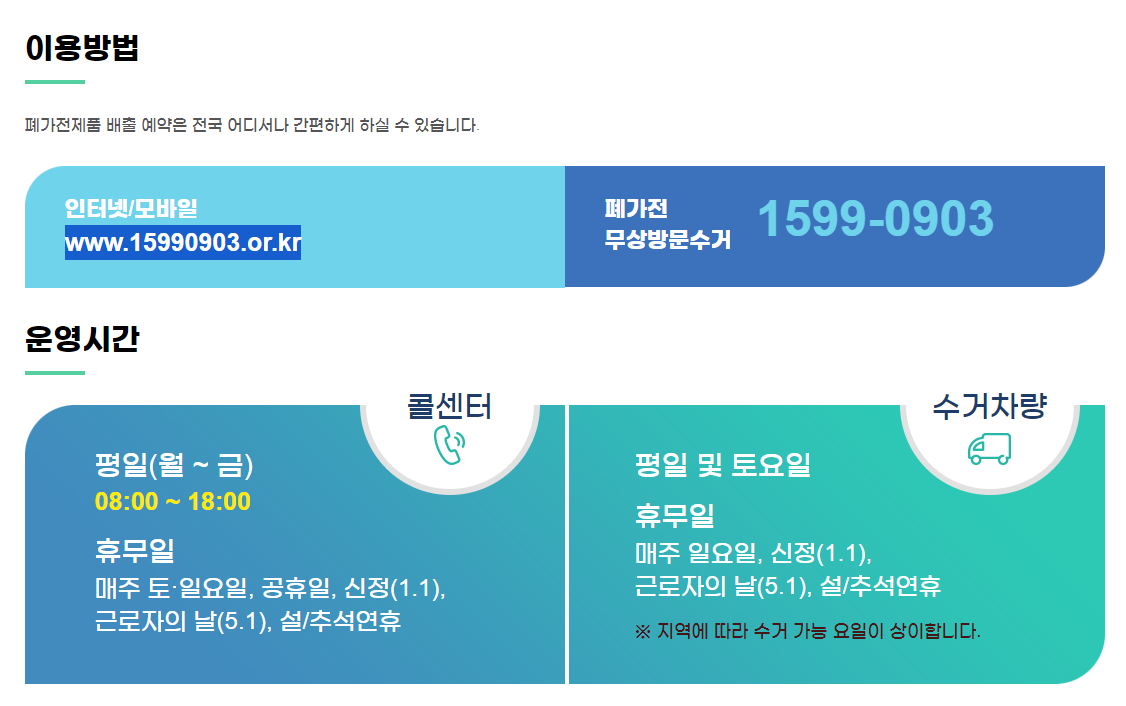 ✅ 수거 방법은 온라인 & 오프라인(콜센터 이용) 또는 모바일 앱을 통한 간단한 신청 3가지 방법이 있습니다.