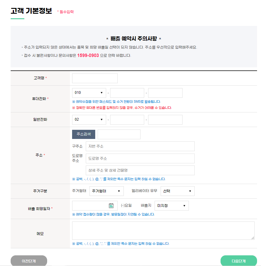고객 기본정보를 입력하셔야 합니다. 빨간 별표시 되어 있는 곳은 필수 입력하시는 곳이기에 명확하게 기재해주셔야 합니다. "고객명, 휴대전화, 주소, 주거 형태, 엘리베이터 유무, 배출희망일자 및 메모"를 적으시면 무상수거 하는데 큰 어려움 없이 배출 서비스를 이용 할 수 있습니다.