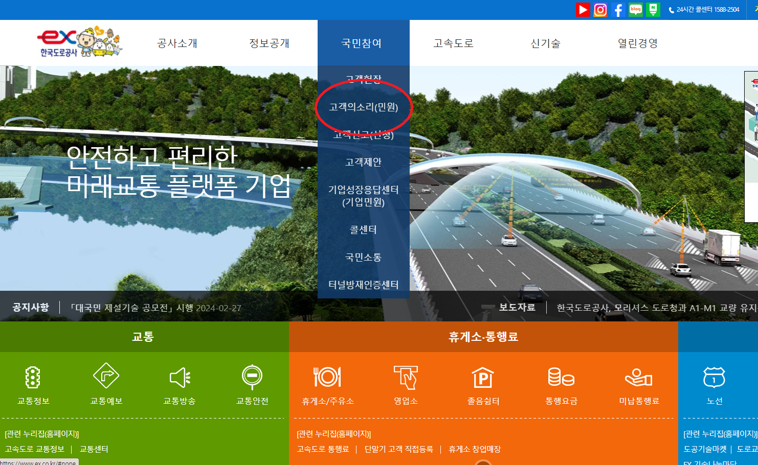 🛑 포트홀 신고 방법은 간단합니다. 한국 도로 공사 홈페이지에 접속 후 국민 참여 부분에 고객의 소리(민원) 서비스를 클릭하시면 됩니다.