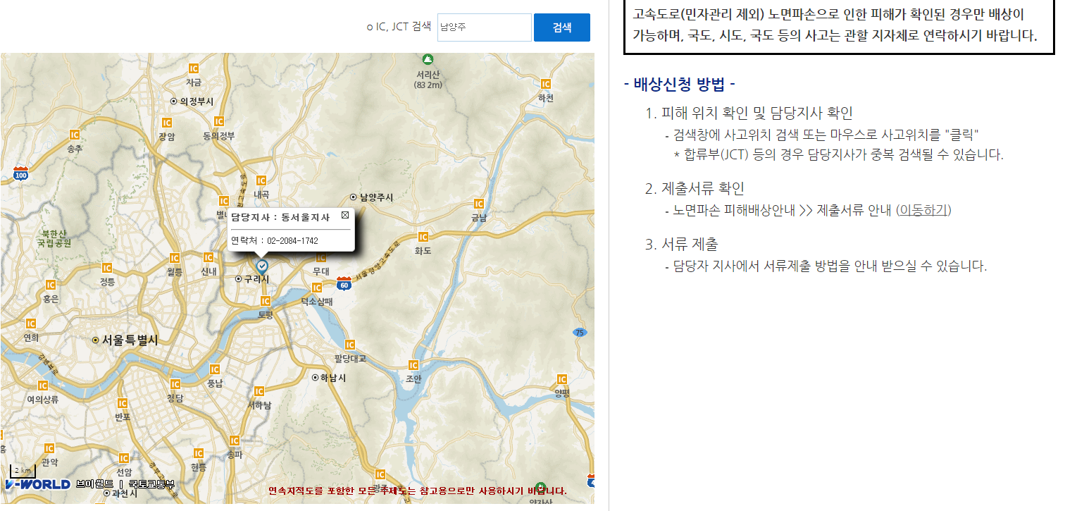 🛑 포트홀로 인해서 차량이 파손 된 지역의 도로를 검색하시면 담당 지사 및 연락처가 나오는데 그 연락처를 통해서 포트홀 배상 사고 접수를 하실 수 있습니다.