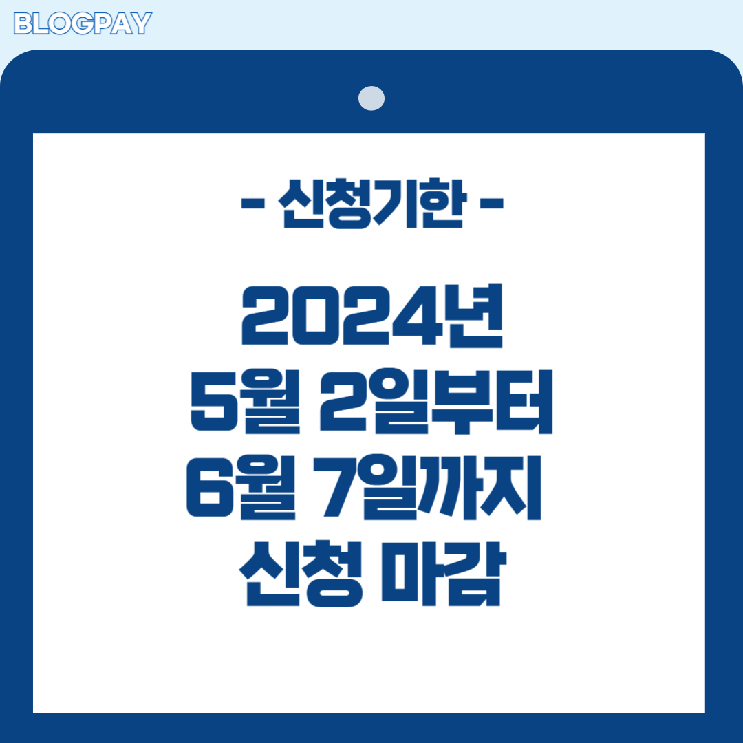 신청 기간은 2024년 5월 2일부터 다음달 6월 7일까지 신청을 받고 있다고 합니다. 시스템 사정상 신청일이 접수마감일 6월 7일로 표기 되는 최종제출 서류 까지만 인정하고 신청을 받고 있다고 하니 늦지 않게 신청하시길 바랍니다.