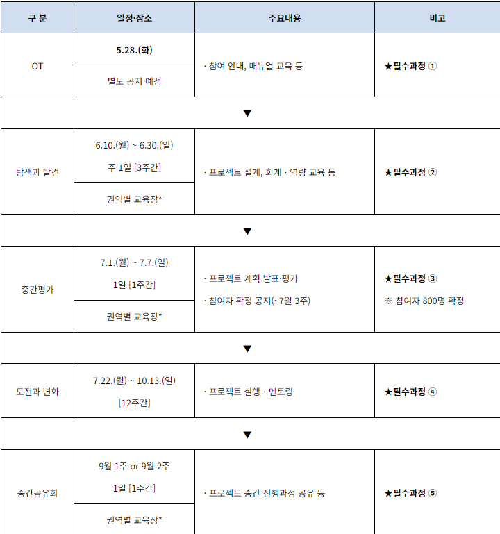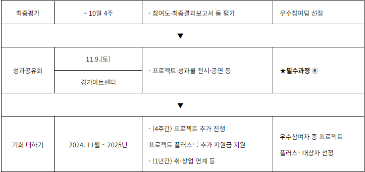 | ✅ 서류심사(지원,프로젝트 계획 내용) | ⏩ | ✅ 면접심사 (1차 서류 작성 내용에 대한 심층면접) |