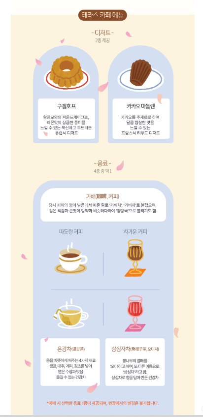 덕수궁은 총 10개의 코스를 이동하면서 해설자의 해설과 함께 덕수궁의 숨겨진 역사적 비밀들에 대한 이야기를 들으며 관람 할 수 있도록 서비스를 제공하고 있습니다. 또한 체험이 끝나면 덕수궁에서 울려 퍼히는 클래식 연주속에서 황실 가배와 달콤한 디저트를 즐기고 마지막에는 접견실 뮤지컬 관람을 통해서 모든 체험이 마쳐지게 됩니다.