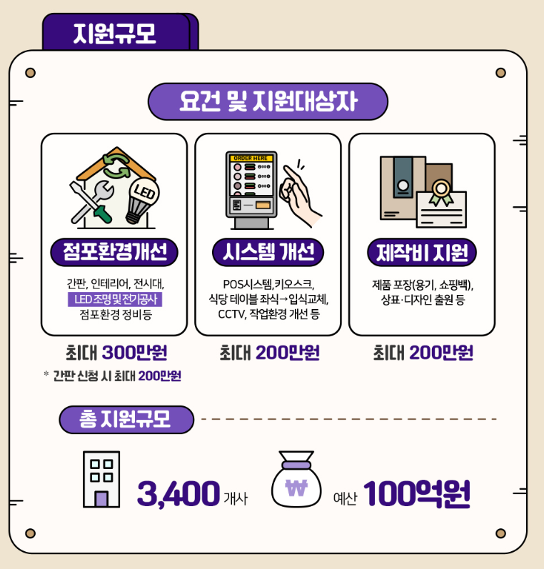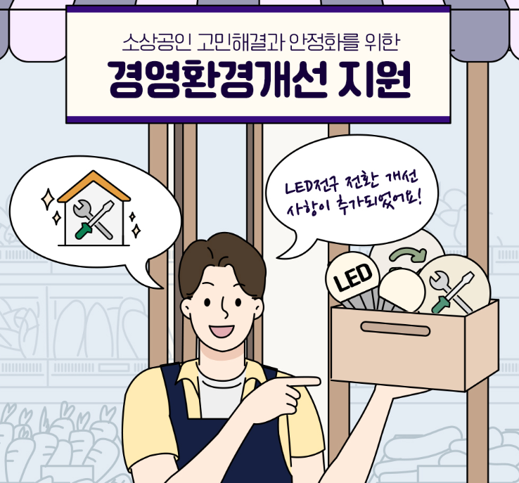 | 점포 환경 개선 | 최대 300만원 | ✅ 간판, 상품전시 재배열, 진열대 판매대 등 ✅ 점포인테리어, LED 조명 및 전기공사, 점포 환경 정비 (간판을 신청할 때는 최대 200만원까지 지원합니다. |