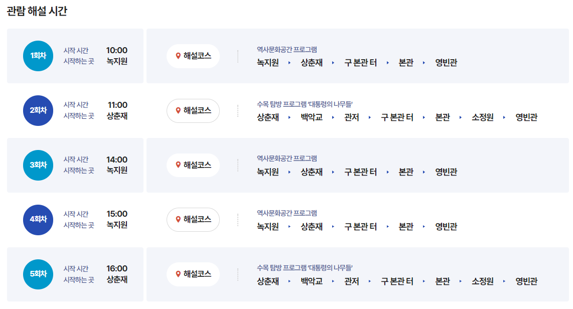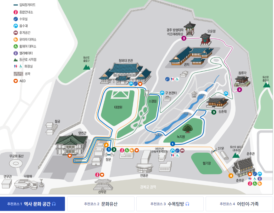 관람 동선 코스를 보면 4가지 코스를 추천하고 있습니다. [역사문화공간, 문화유산, 수목탐방, 어린이 가족]에 맞추어 코스와 해설 그리고 시간등이 각기 다르기 때문에 동선 추천 코스를 보시고 내가 원하는 코스를 선택하셔서 청와대를 관람하시는 것을 권해드리고 있습니다.