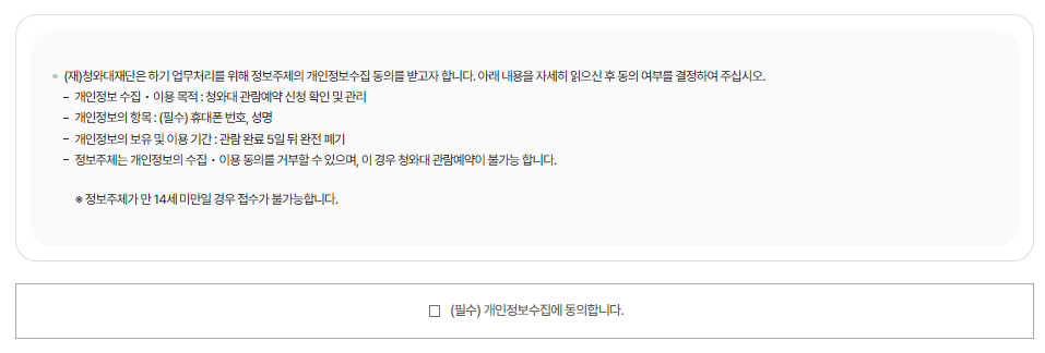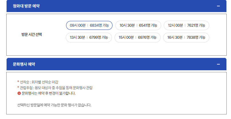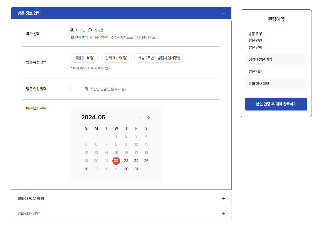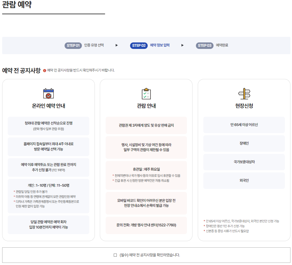 ✅ 청와대 개방 관람 예약은 [청와대 공식 홈페이지]를 통해서만 신청을 하실 수 있습니다. 청와대 홈페이지 접속 후 회원가입 절차 없이 간단한 본인 인증을 통해서 내가 가고자 하는 날짜와 인원을 지정하시고 예약하시면 됩니다. 단 주의사항은 내가 방문하고자 하는 시간에 인원이 몰리면 예약이 불가 할 수 있으니 이점 꼭 참고해 주셔야 합니다.