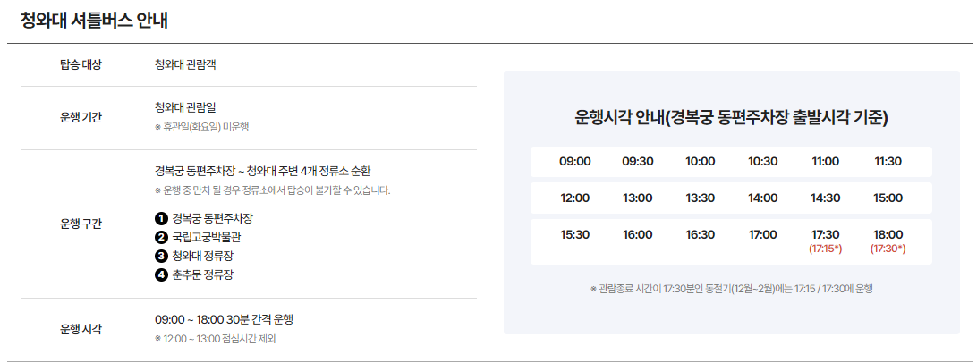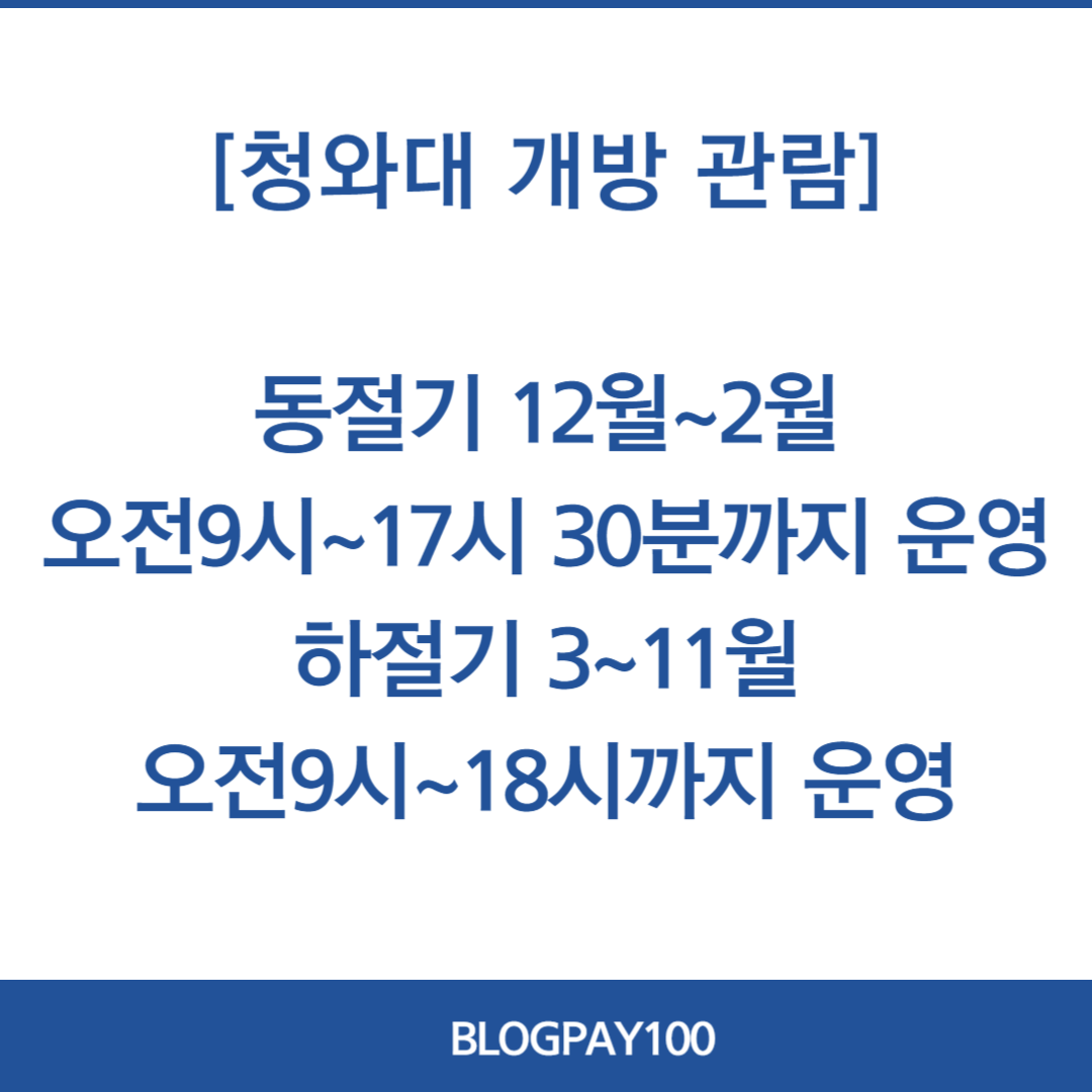 ✅ 청와대 개방 입장은 동절기 하절기 관람 시간이 각기 다릅니다. 3-11월은 오전 9시 -18시까지 운영을 하고, 12월 -2월은 9시부터 17시 30분까지 개방을 하고 있다고 합니다. 또한 화요일은 정기 휴무일로 개방하지 않지만 대체공휴일과 겹치는 경우 정상 운영 한다고 하니 이점 꼭 참고하셔야 합니다.