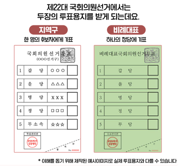 ✅ 이번 22대 국회의원 선거 투표 용지는 총 2장을 받게 됩니다. 흰색 종이는 지역구 한명의 후보자에게 기표를 하는 투표 용지와 두 번째 초록색 비례대표 내가 지지하는 정당을 선택 할 수 있는 투표 용지를 받게 됩니다. 위에 그림은 이해를 돕기 위해서 만들어진 이미지이기에 실제 투표 용지와 다를 수 있습니다.