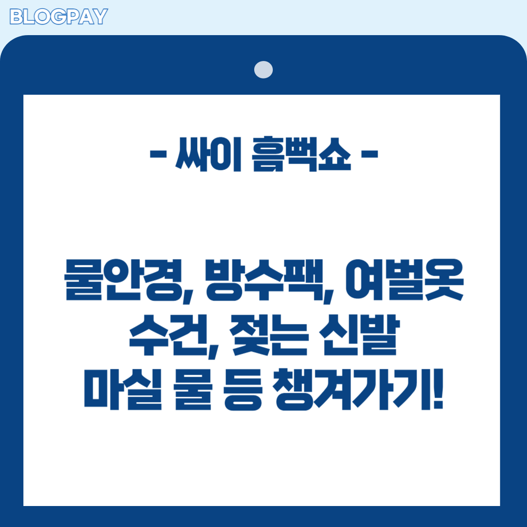 👉 콘서트 티켓 예매에 성공하신 분들은 이제 설레는 마음으로 콘서트 준비물을 준비해 주셔야 합니다. 가장 중요한 것이 티켓과 신분증이고 야외 콘서트인 만큼 그리고 물에 젖는 흠뻑쇼인 만큼 여벌옷과 여러가지 준비물을 준비해 주셔야 합니다.