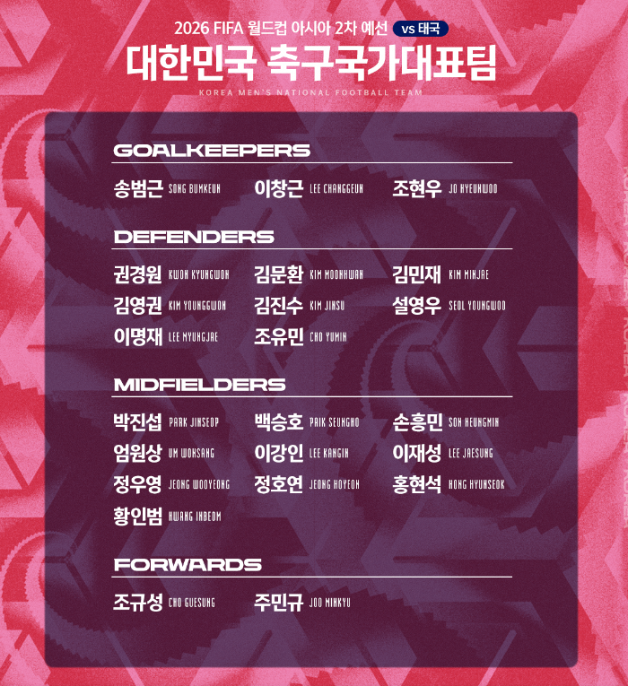 ✅ 최근 감독 이슈로 인해서 감독직에 대해서 말들이 많이 있었는데요. 그래서 이번에 황선홍 감독이 아닌 홍명보 임시 감독 체제로 대표팀 명단이 변경이 되었다고 합니다. 태국전 명단을 살펴보면 이슈가 있었던 선수들도 여전히 들어가 있는 것을 볼 수 있습니다. 그리고 엔트리가 크게 변하지도 않은 것 같습니다. 총 23명의 선수단이 선별되어 위에 그림과 같이 발표가 되었습니다.
