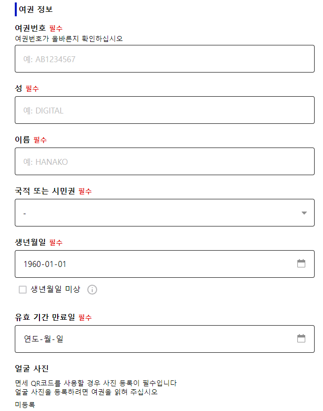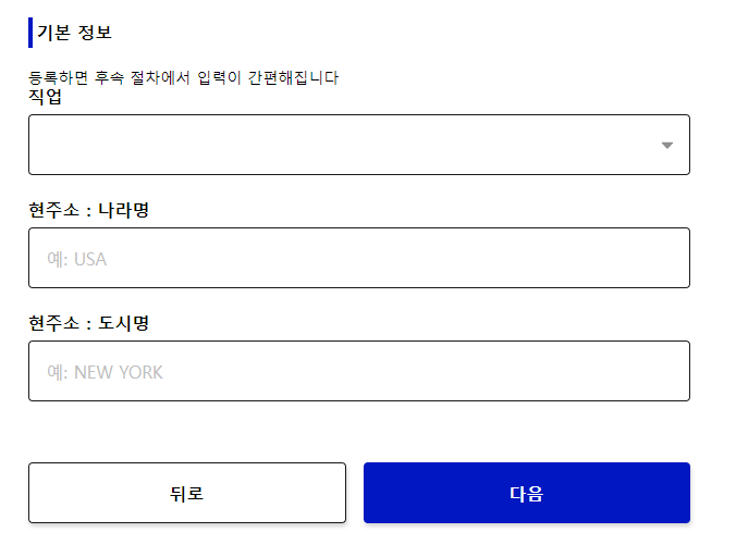 3️⃣ 여권 정보 및 영문 이름을 적어주시고 국적과 시민, 생년월일, 여권번호 유호기관 만료일 그리고 기본정보를 적어주시면됩니다. 여기서 현주소 나라명은 SOUTH KOREA로 적어주시고 다음을 클릭하시면 모든 정보가 입력이 되고 완료가 되어집니다.