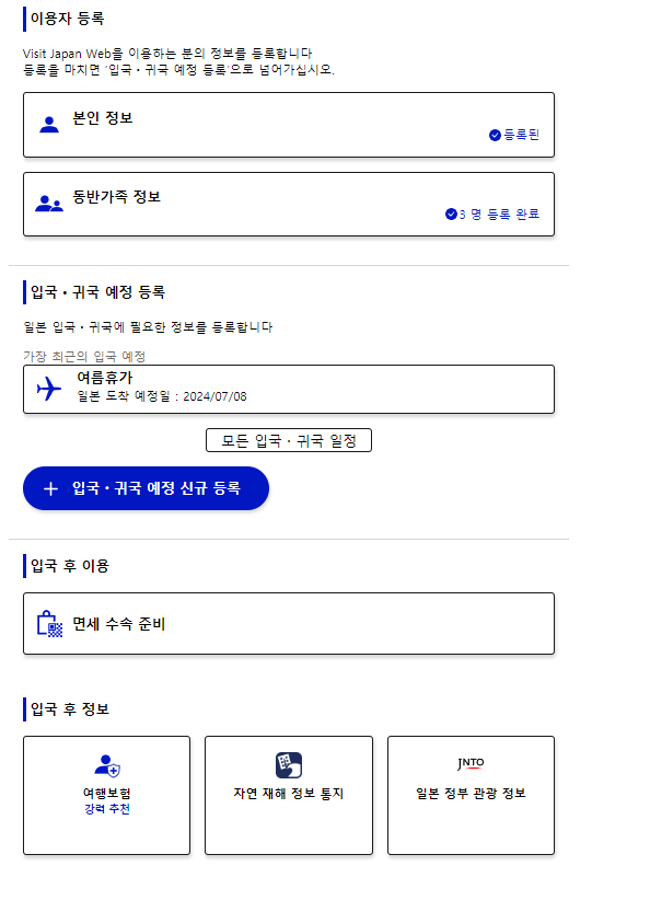 모든 등록이 완료가 되셨다면 입국하기 전 내가 등록한 visit web QR코드를 확인하셔야 합니다. 메인 화면에 입국, 귀국 예정을 등록하신 후 내가 여행하는 날짜를 등록하시면 QR코드가 자동으로 발급이 되어집니다. 아래 화면과 같이 입국 귀국 예정 등록 부분을 클릭하시면 수속 안내에 대한 QR 코드 확인부분이 나옵니다.