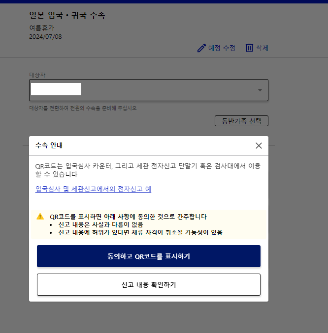 ✅ 동의하고 QR 코드를 표시하기를 누르시면 내가 등록한 visit 정보와 가족에 대한 정보 QR 코드가 발급이 되어진 부분이 나옵니다. 그리고 일본에 입국 하실 때 QR 코드를 제시하면 아무런 문제 없이 입국 할 수 있습니다.