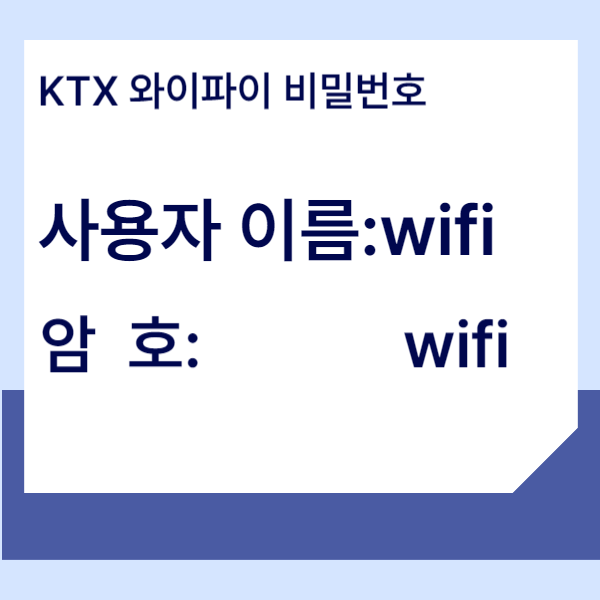 👉 KTX 무료 와이파이 비밀번호 등록은 아주 간단합니다. 위에 2가지 와이파이 종류 중 1가지를 선택하면 [사용자 이름과 암호]를 넣는 부분이 나오는데 그 부분에 wifi 이 단어를 입력해 주시면 무료 공공 와이파이 연결 끝입니다.