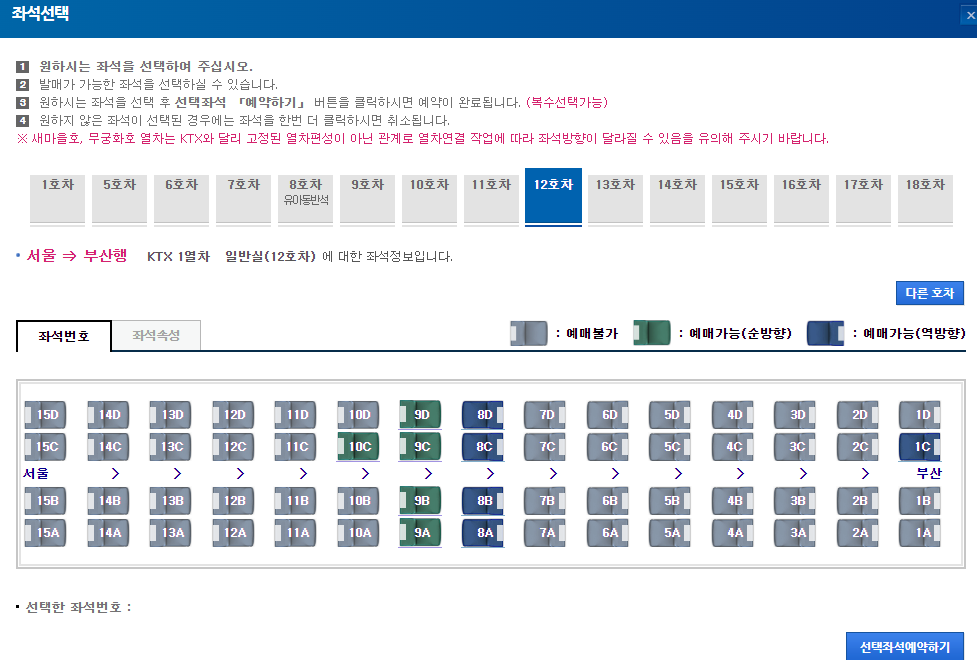 5️⃣ KTX 열차를 보면 1-18호차까지 있습니다. 저는 12호차를 선택했더니 예매 가능한 좌석이 5좌석이 나옵니다. 이 중에 내가 원하는 좌석을 하나를 클릭하고 선택좌석 예약하기를 클릭합니다.