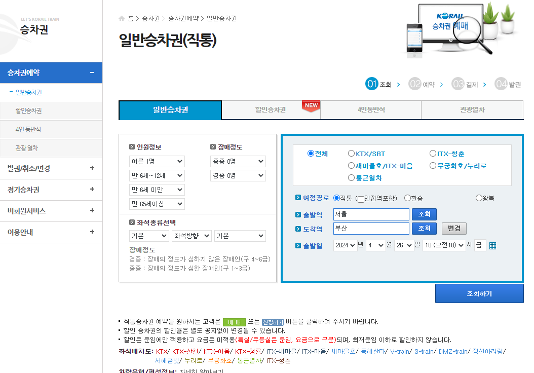 일반 승차권 부분에 왼쪽 부분은 인원 정보, 오른쪽은 내가 타고자 하는 열차를 선택하시면 됩니다. 우리는 KTX를 타야 하기 때문에 KTX를 클릭하시고 인원 정보 및 여행에 대한 정보를 선택 후 조회하기를 클릭합니다.