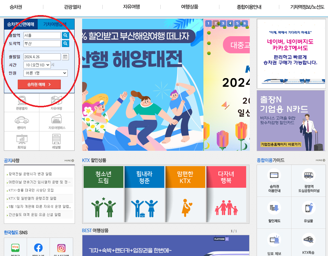 1️⃣ 첫 번째 KTX 예매를 위해서 공식 홈페이지에 접속해주신 후 가장 왼편에 위치한 [승차권 간면 예매] 부분에 출발역, 도착역, 출발일, 시간, 인원을 선택해 주신 후 빨간 버튼인 승차권 예매를 클릭해 주시면됩니다.