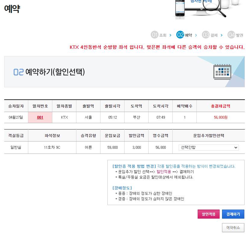 6️⃣ KTX 기차 예약은 10분 이내 결제를 완료해야 발권이 진행이 되어집니다. 마지막 결제하기 전 할인 받을 수 있는 분들 [장애인, 다둥이 등] 할인 적용을 클릭하신 후 적용된 금액으로 결제를 진행하시면 모든 발권이 마무리가 되어집니다.